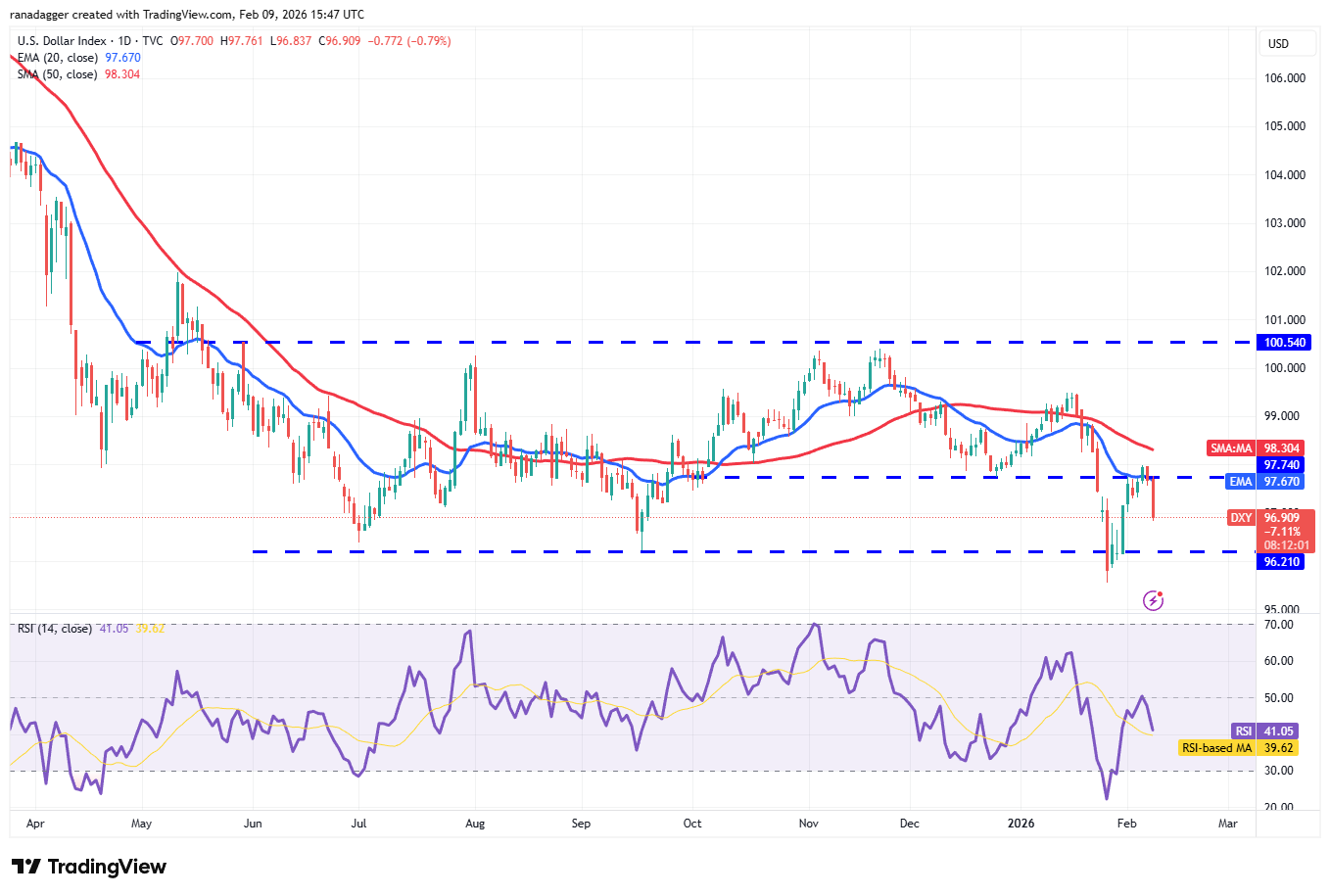 В понедельник цена резко ушла ниже 20-дневной EMA, что показывает попытку продавцов перехватить инициативу. Сильная зона поддержки находится в диапазоне 96,21–95,51, но если давление сохранится, индекс может снизиться к 91,88.