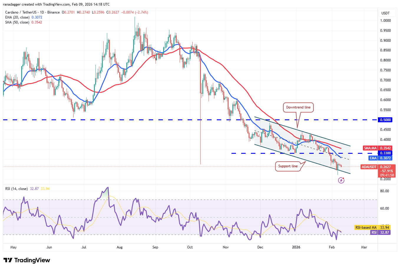 Слабый отскок Cardano (ADA) от линии поддержки нисходящего канала говорит о том, что на росте продолжаются продажи.