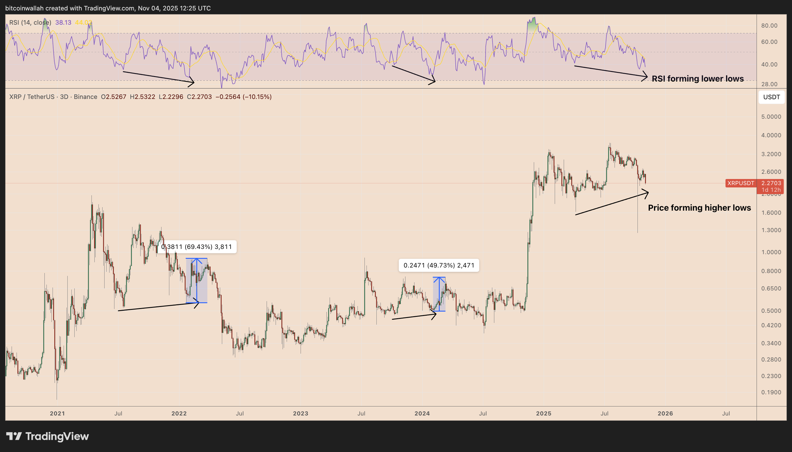 На 3-дневном графике XRP выявляется "скрытая бычья дивергенция", при которой цена формирует более высокие минимумы, тогда как индекс относительной силы (RSI) показывает более низкие минимумы. В техническом анализе это часто интерпретируется как ослабление нисходящего движения.