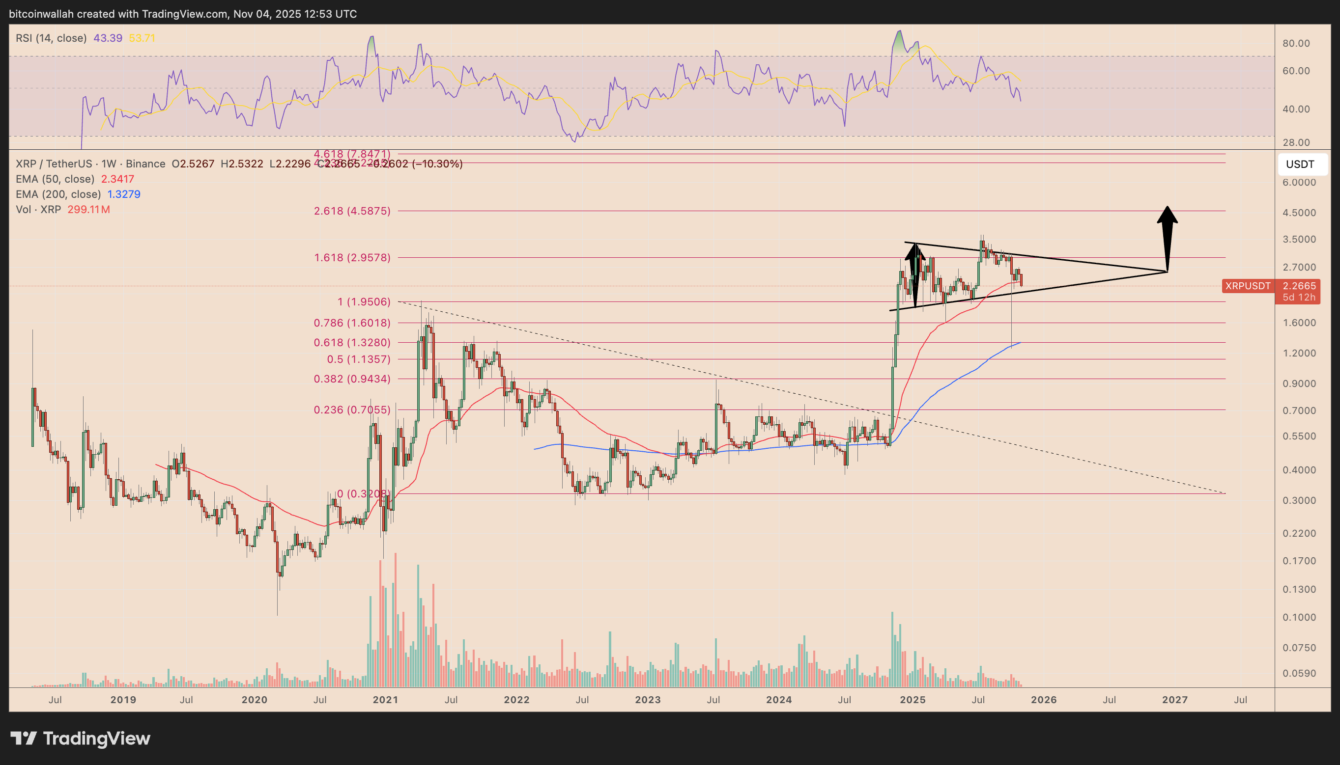Целевая цена вверх для симметричного треугольника составляет около $5, в случае прорыва это представляет собой рост примерно на 115% от текущих ценовых уровней.