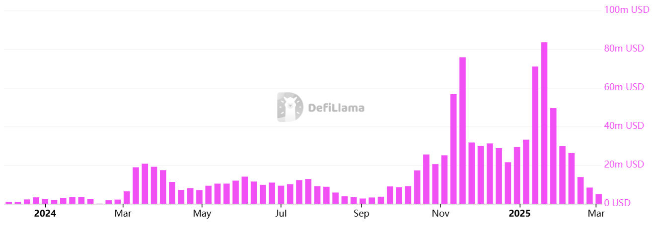 Снижение активности на блокчейне указывает на уменьшение интереса к SOL, причем сборы в сети Solana уменьшились на 73% по сравнению с данными четырехнедельной давности согласно DefiLlama. Основной же причиной роста активности были запуски мем-монет и торговля на децентрализованных биржах, однако снижение динамики SOL остается фактом.