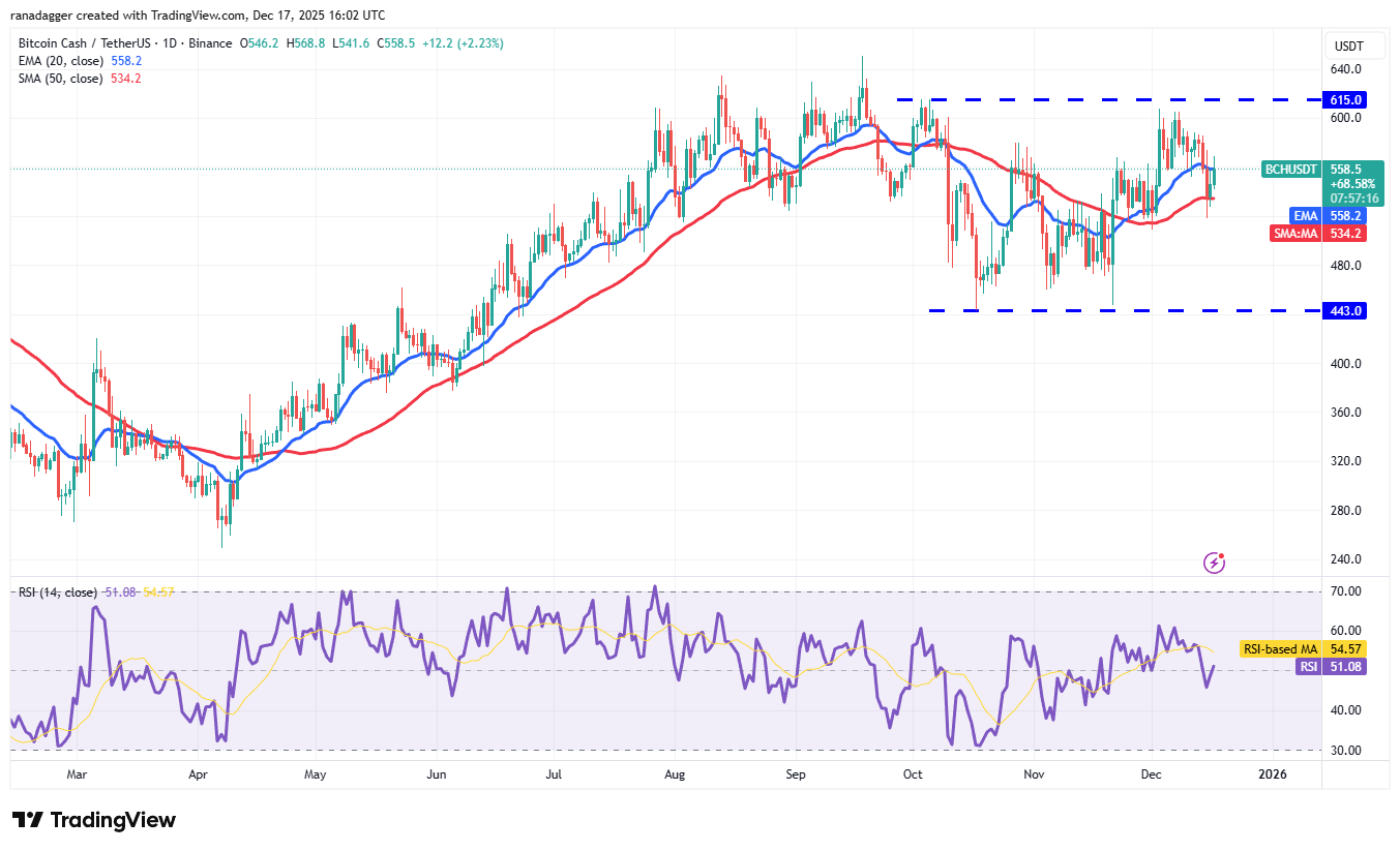 Bitcoin Cash (BCH) отскочил от 50-дневной SMA ($534) во вторник, и быки пытаются удержать цену выше 20-дневной EMA ($558) в среду.