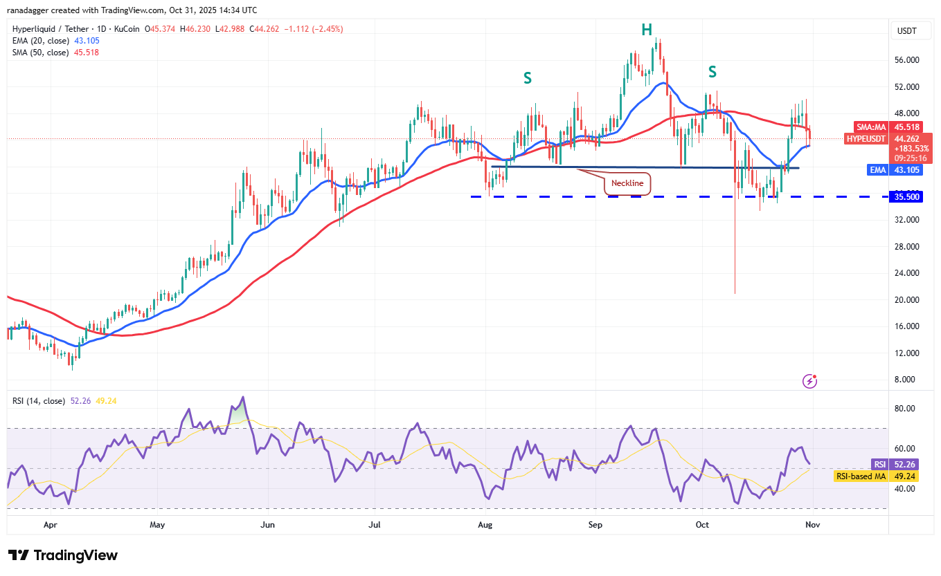 Продавцы вновь сорвали попытки покупателей подтолкнуть цену Hyperliquid (HYPE) выше сопротивления $51.50 в четверг, что привело к снижению цены до 20-дневной EMA ($43.10).