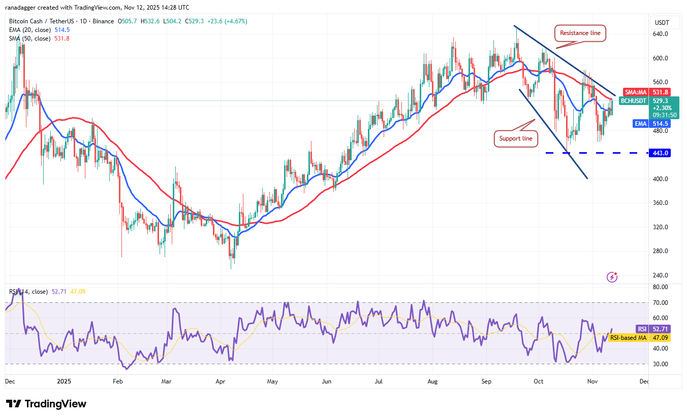 Быки вновь пытаются пробиться выше линии сопротивления. Если это произойдет, это укажет на потенциальную смену тренда. Пара BCH/USDT может подняться к зоне сопротивления $615—$651, где ожидается сильное сопротивление медведей.