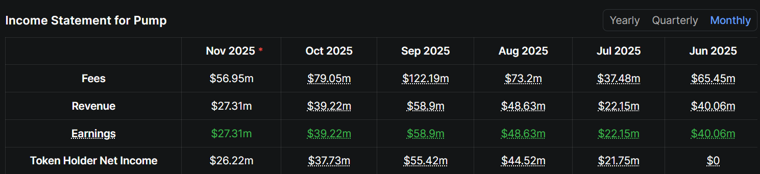 Ежемесячный доход Pump.fun упал ниже $40 миллионов впервые с июля, снизившись до $27,3 миллиона в ноябре, что на 53% меньше по сравнению с $58,9 миллиона в сентябре, согласно данным DefiLlama.