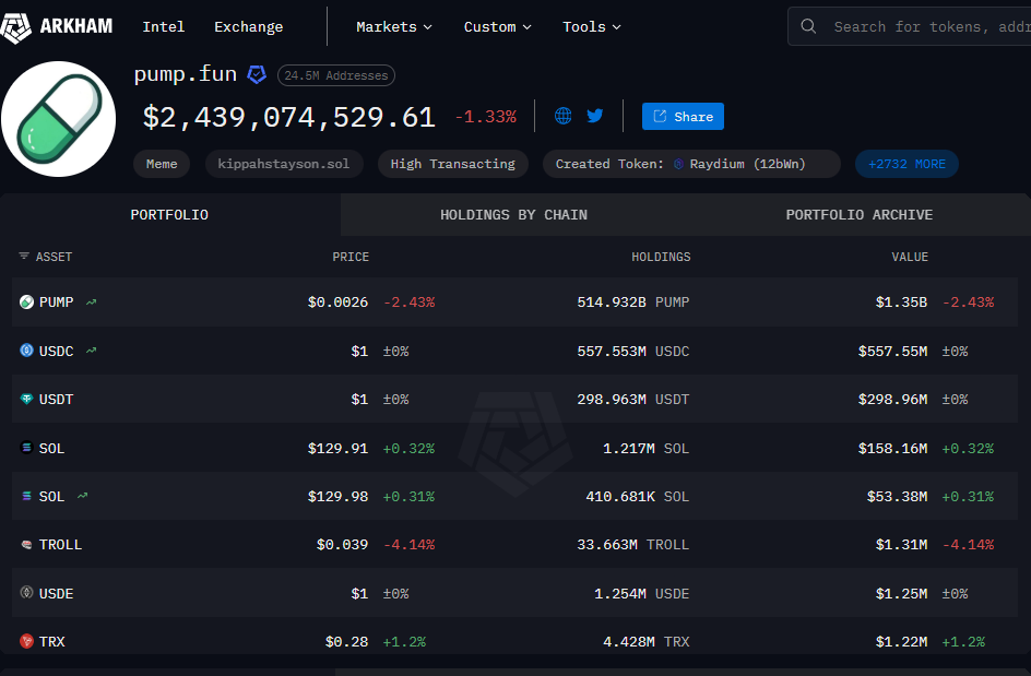 Кошелек Pump.fun все еще содержит примерно $855 миллионов стабильных монет и $211 миллионов в токенах Solana, согласно данным платформы Arkham.