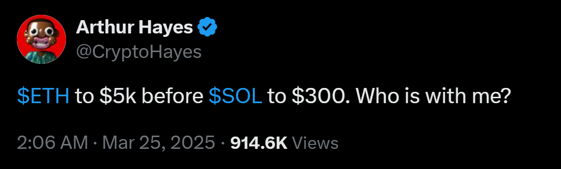 Артур Хейз, соучредитель BitMEX, установил ценовую цель в $5,000 для ETH 25 марта, заявив, что он должен значительно превосходить конкурента Solana (SOL).