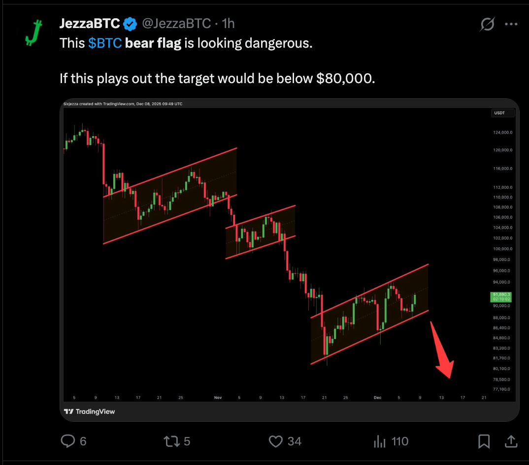 Дальнейшая проверка медвежьего флага показала, что его техническая цель на декабрь находится в районе $77,100, что рассчитывается путем добавления высоты предыдущего нисходящего тренда к потенциальной точке падения возле поддержки в $88,000.