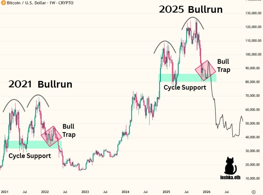 Leshka предупреждал, что биткойн может снова опуститься в регион $40,000 в начале 2026 года, что будет снижением на более чем 50% от текущих уровней, если этот паттерн повторится.