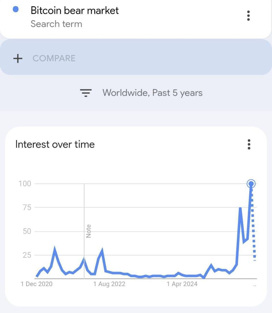На прошлой неделе, по данным Google поиски по фразе «медвежий рынок биткойна» достигли рекордно высокого уровня за последние пять лет, как отметил аналитик AndrewBTC в своем посте на X, заявив, что толпа BTC снова боится.