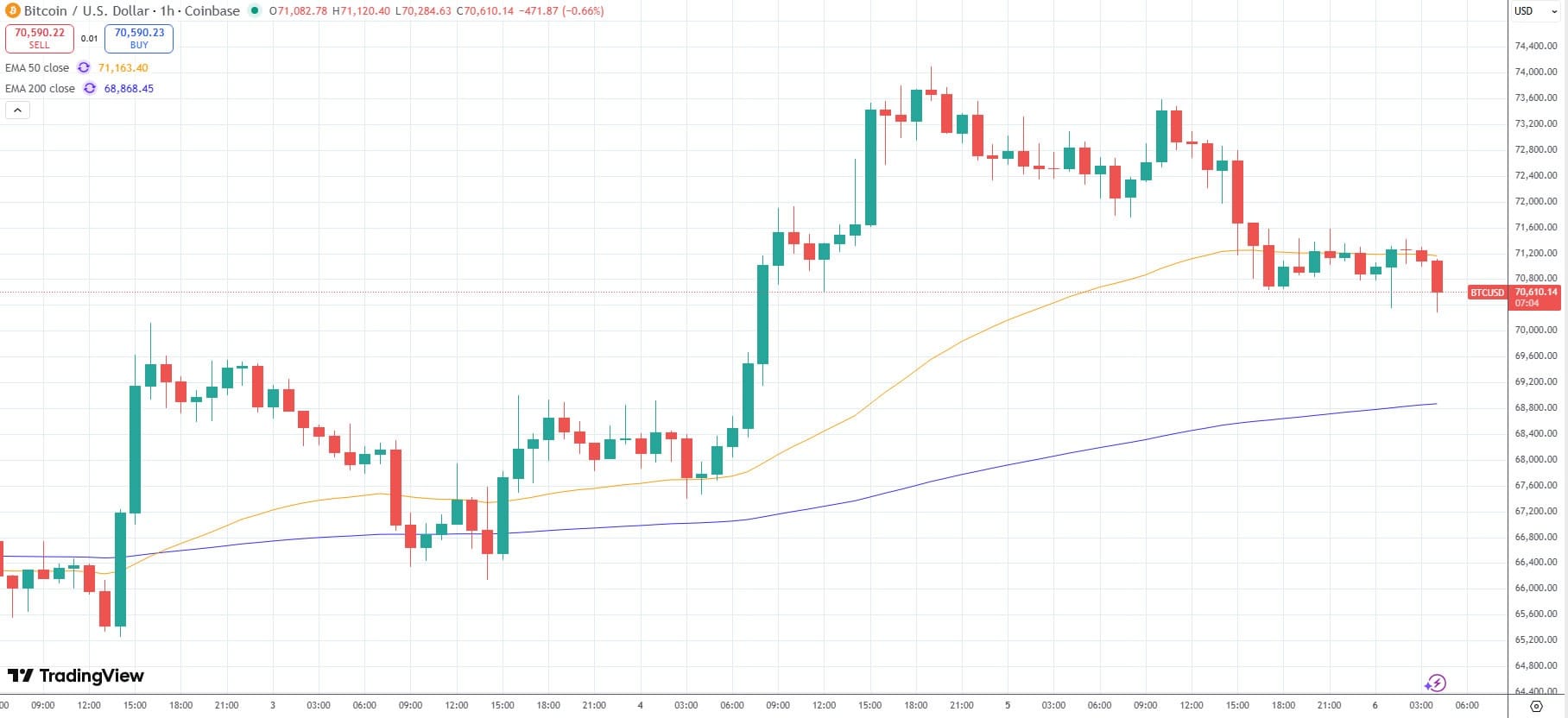 По данным TradingView, в четверг на Coinbase цена кратковременно достигла месячного максимума около $74 000 и коснулась 50-дневной экспоненциальной скользящей средней. Однако затем биткоин потерял более $3 000 и в пятницу утром откатился ниже $71 000.