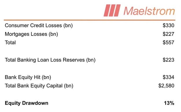 Согласно его приблизительной модели, если число «работников умственного труда» в США сократится на 20% от примерно 72 млн человек, это может привести примерно к $557 млрд потерь по потребительским кредитам и ипотеке, что эквивалентно списанию около 13% капитала коммерческих банков США.