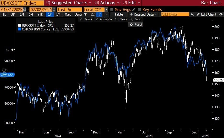 По его словам, популярный тезис о том, что «биткоин и крипто сломались и цикл завершен», не выдерживает критики, поскольку одновременно снижаются и акции компаний сегмента Software as a Service (SaaS).