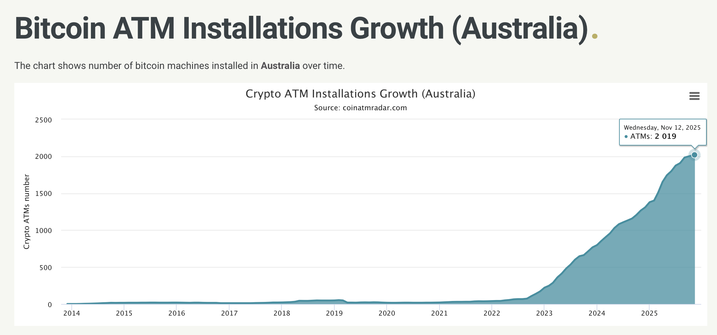 США лидируют с 30,869 Bitcoin-киосков, однако рост наблюдается и в других странах. Австралия, например, увеличила количество машин с 21 в 2021 году до 2,019 на сегодня, став третьим крупнейшим центром Bitcoin-банкоматов после США и Канады.