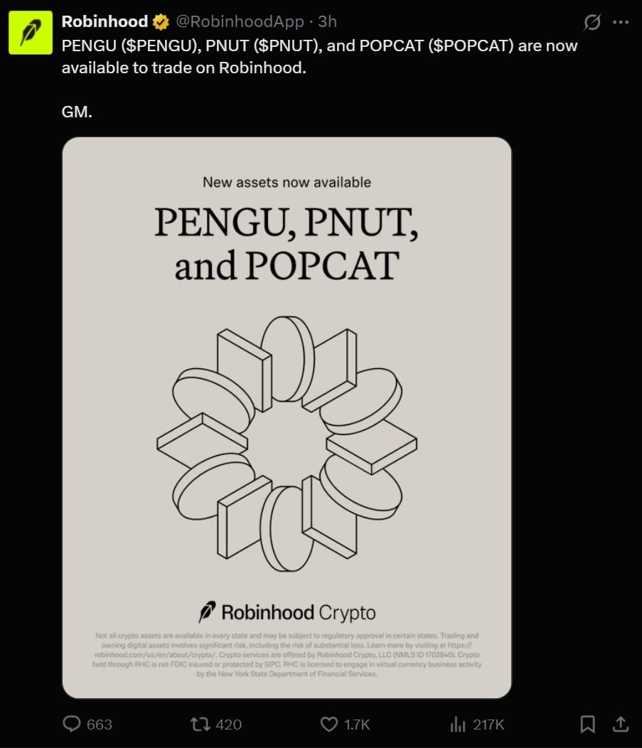 Robinhood добавила мемкойны Pengu (PENGU), Pnut (PNUT) и Popcat (POPCAT), сообщает онлайн-брокерская компания 13 марта. Это новое добавление связано с усилиями Robinhood расширить свои криптовалютные предложения и конкурировать с такими биржами, как Coinbase. Торговля мемкойнами стала ключевой ареной конкуренции, так как соперничающие биржи, включая Coinbase и Binance.US, ускоряют добавление новых криптовалют.