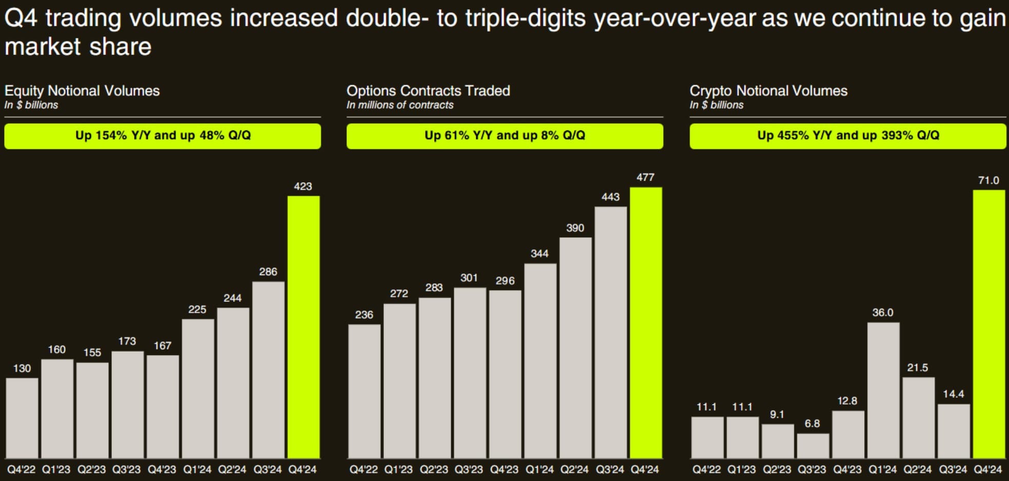Изменение объемов торгов Robinhood для акций, опционных контрактов и криптовалют. Источник: Robinhood