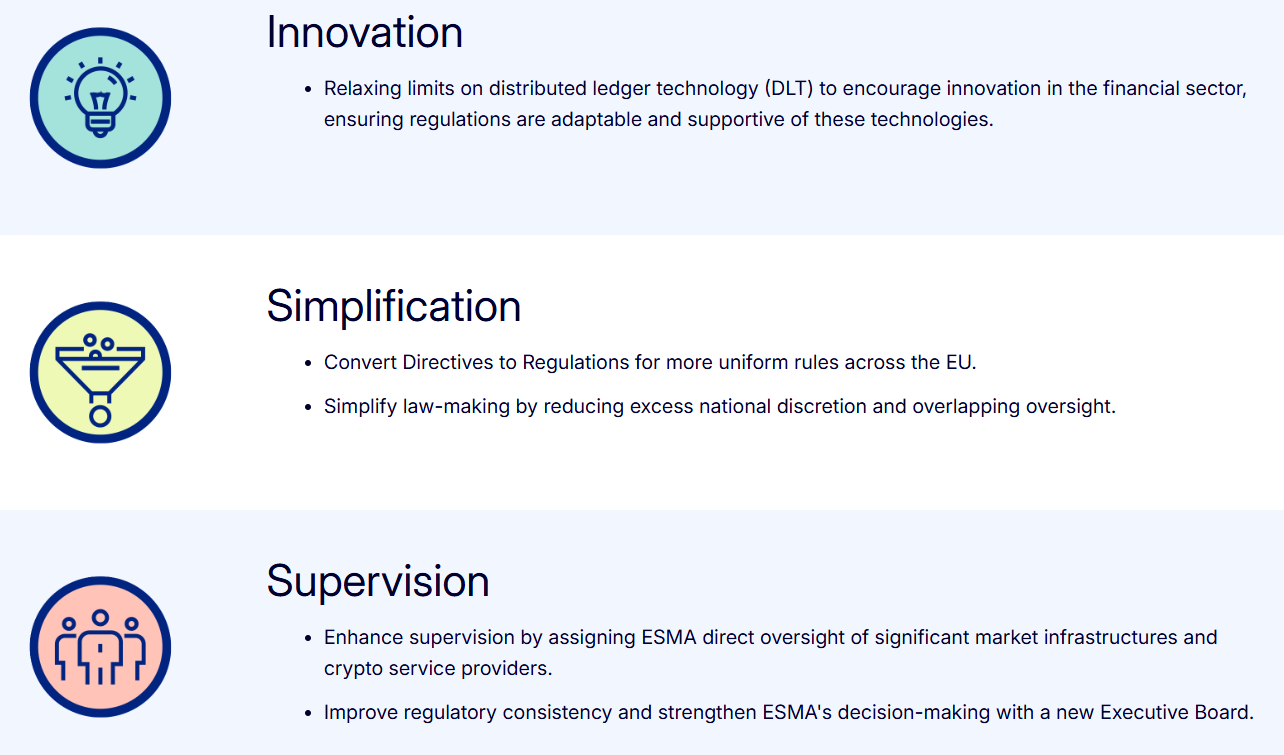 Опубликовано в четверг, пакет предусматривает передачу "прямых надзорных полномочий" за ключевой рыночной инфраструктурой, включая поставщиков услуг по криптоактивам, торговые площадки и центральные контрагенты, ESMA, а также укрепление ее роли в координации управления активами.
