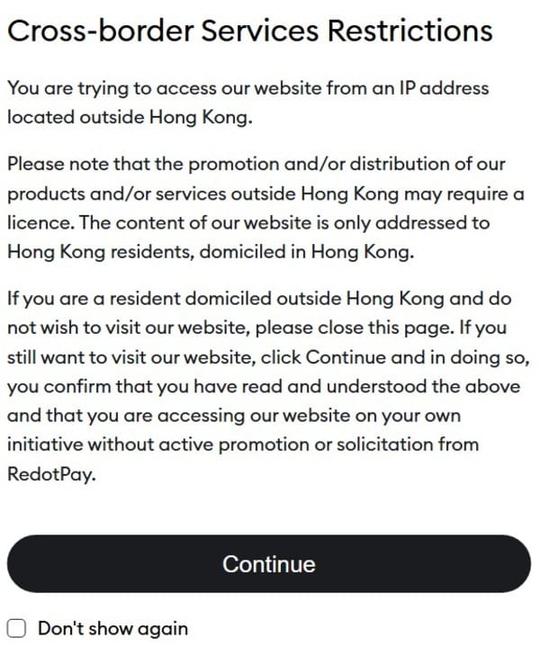 Тем не менее, RedotPay имеет ограничения на предоставление услуг за пределами Гонконга. Посетители из других стран получают предупреждение при попытке зайти на сайт компании.