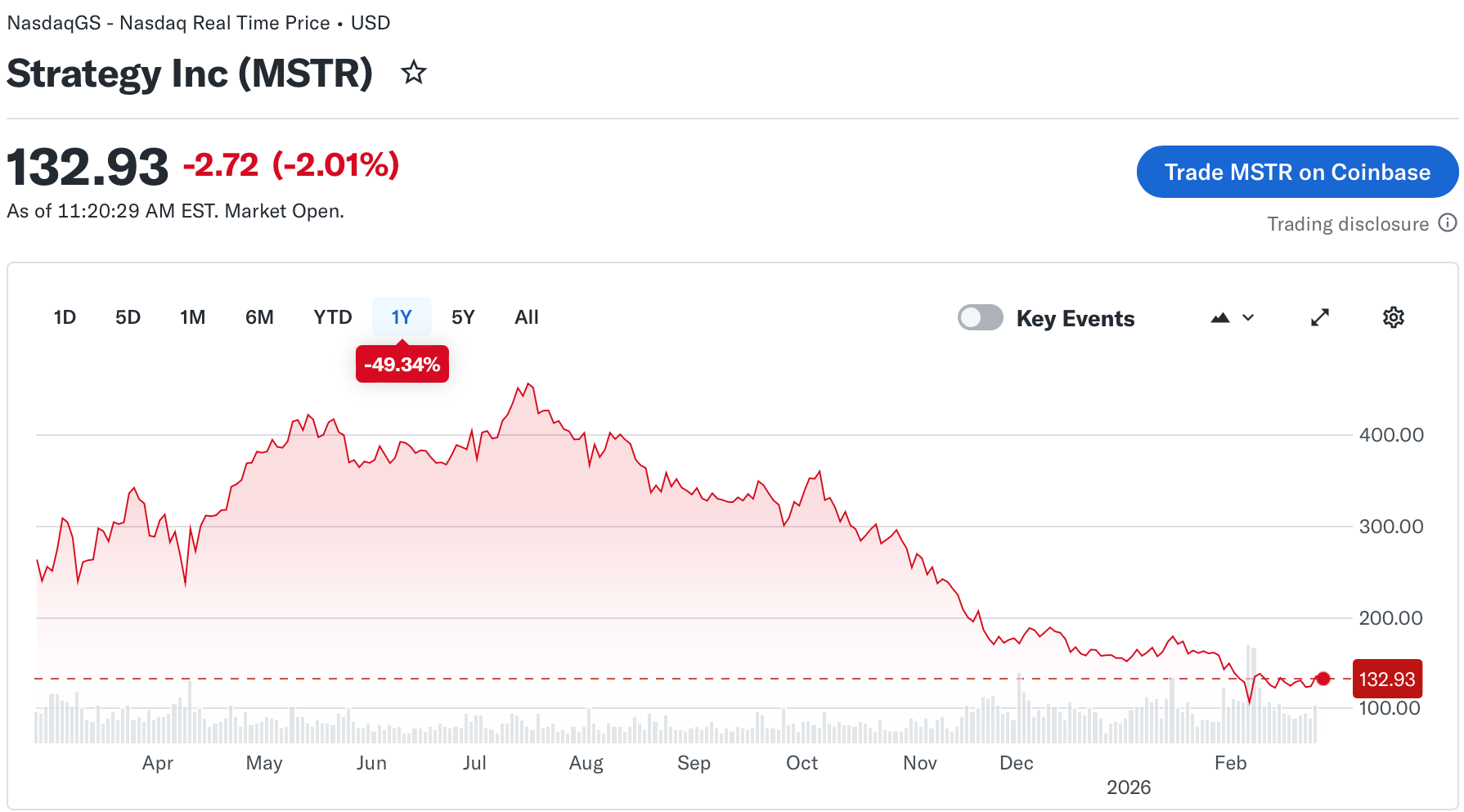 Несмотря на интерес к инструментам, связанным со Strategy, акции компании снижались вместе с ценой биткоина. За последние шесть месяцев бумага упала более чем на 60%, а за год — примерно на 50%, следует из данных Yahoo Finance.