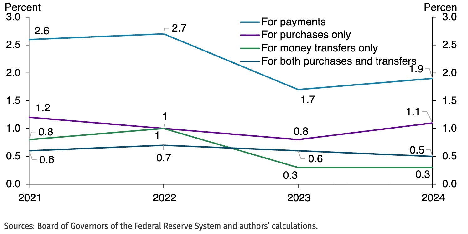 Тем не менее, поведение при оплатах развивается медленно. Исследование Федерального резервного банка Канзас-Сити указывает, что менее 2% потребителей из США используют криптовалюту для платежей, например, для покупок или денежных переводов. Многие люди держат криптовалюту как инвестицию или способ перевода средств между сервисами, и они все еще предпочитают банковские карты в супермаркетах.