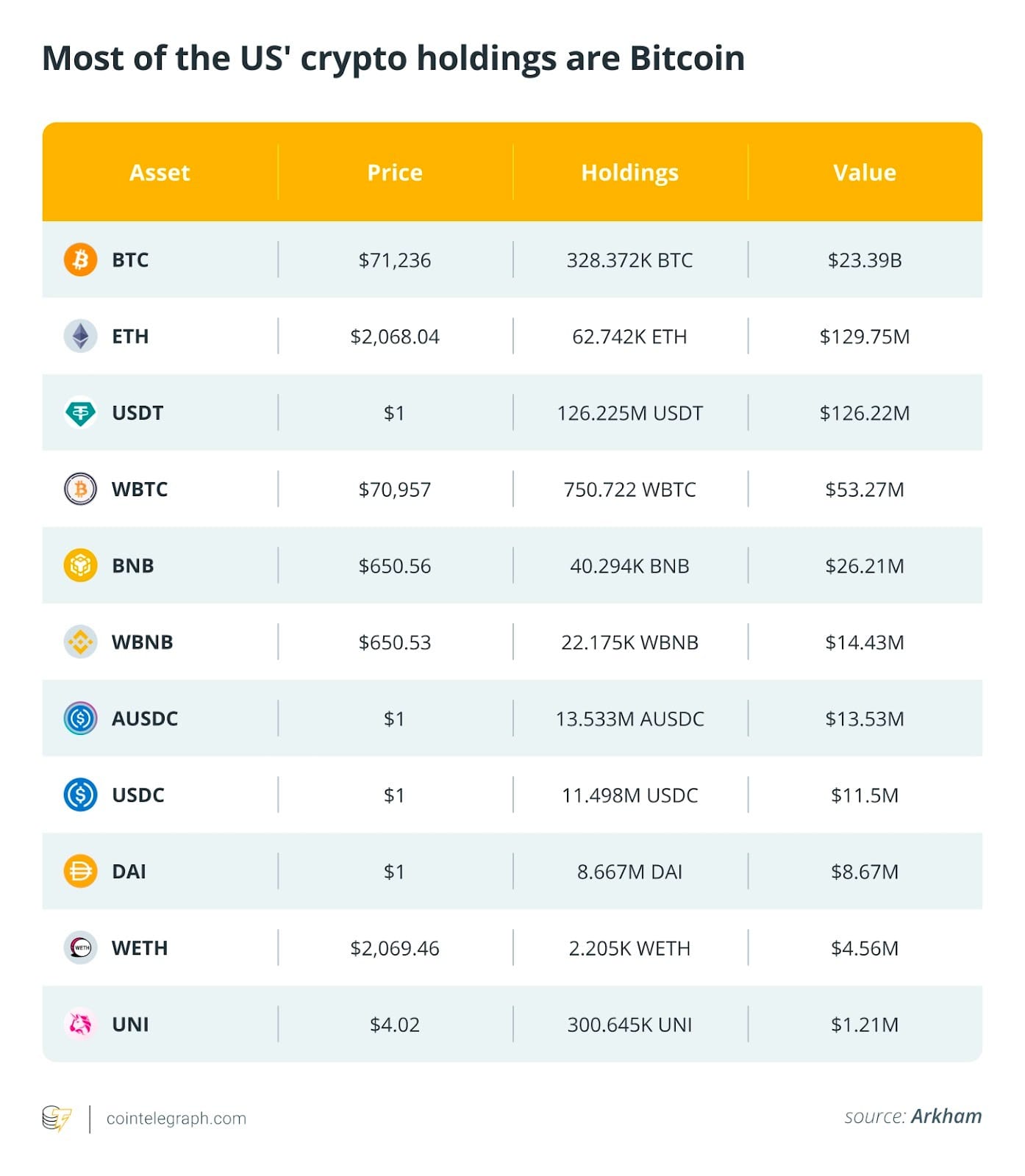 По оценке Arkham, на момент публикации криптоактивы правительства США стоят около 22,39 млрд долларов, из них примерно 22 млрд приходится на биткоин. Среди прочих крупных позиций — USDC, Ether, Wrapped Bitcoin и BNB.