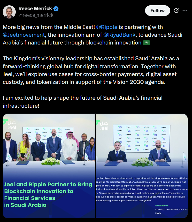 О сотрудничестве в понедельник сообщил Рис Меррик, старший исполнительный директор Ripple и управляющий директор по Ближнему Востоку и Африке. По его словам, компания работает с Jeel — инновационным юнитом Riyad Bank — в рамках соглашения, направленного на анализ возможных сценариев использования блокчейна.
