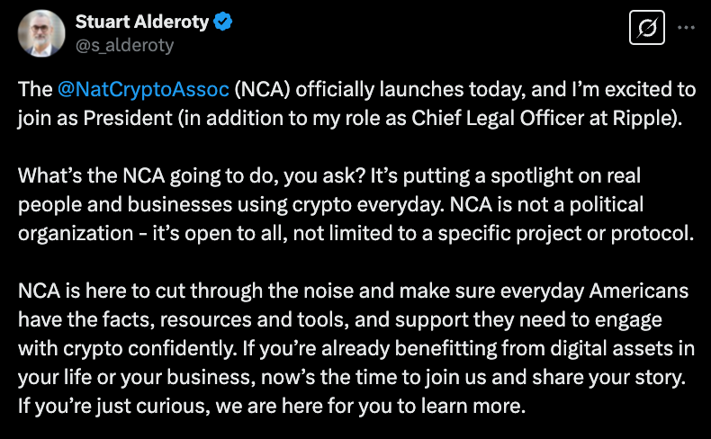 5 марта главный юрисконсульт Ripple Стюарт Альдероти сообщил, что станет президентом новообразованной Национальной Ассоциации Криптовалют (NCA), продолжая работать в компании. Генеральный директор Брэд Гарлингхаус заявил, что Ripple профинансирует некоммерческую организацию грантом в размере $50 миллионов.