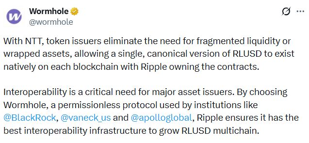 Команда Wormhole сообщила в посте на X в понедельник, что его стандарт Native Token Transfers позволит RLUSD перемещаться между блокчейнами в виде оригинального токена, а не в виде синтетической или обернутой копии, что поможет сохранить ликвидность.