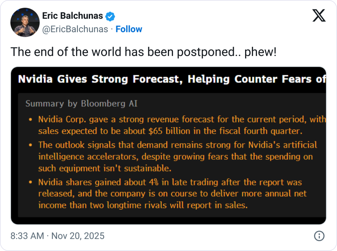 Акции технологических и криптокомпаний выросли на внебиржевых торгах в среду после того, как финансовые результаты Nvidia за третий квартал превзошли ожидания, развеяв опасения насчет "пузыря ИИ".