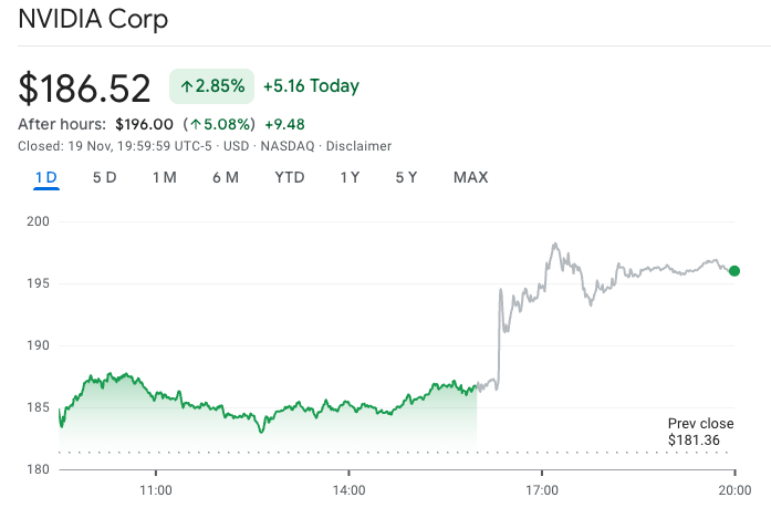 Акции Nvidia (NVDA) подскочили более чем на 5% на внебиржевых торгах после публикации результатов за третий квартал до 196 долларов после закрытия сессии в среду с ростом на 2,85% до 186,52 доллара.