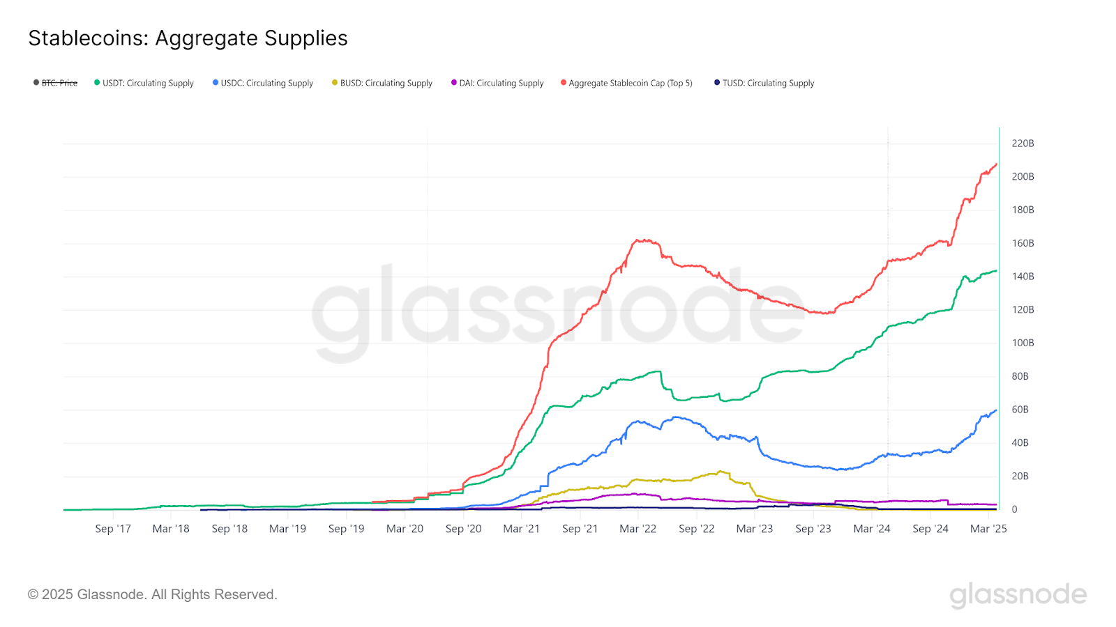 Совокупная эмиссия стейблкоинов достигла рекордного уровня выше $208 млрд по пяти крупнейшим стейблкоинам на 28 марта, согласно данным Glassnode.