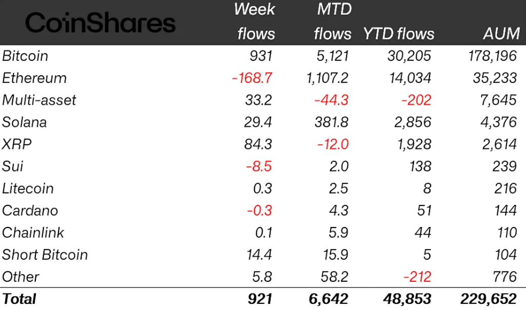 На прошлой неделе в крипто биржевые торгуемые продукты (ETP) поступило $921 миллион, что более чем компенсировало отток в $513 миллионов, произошедший на неделе ранее, сообщил CoinShares в понедельник.