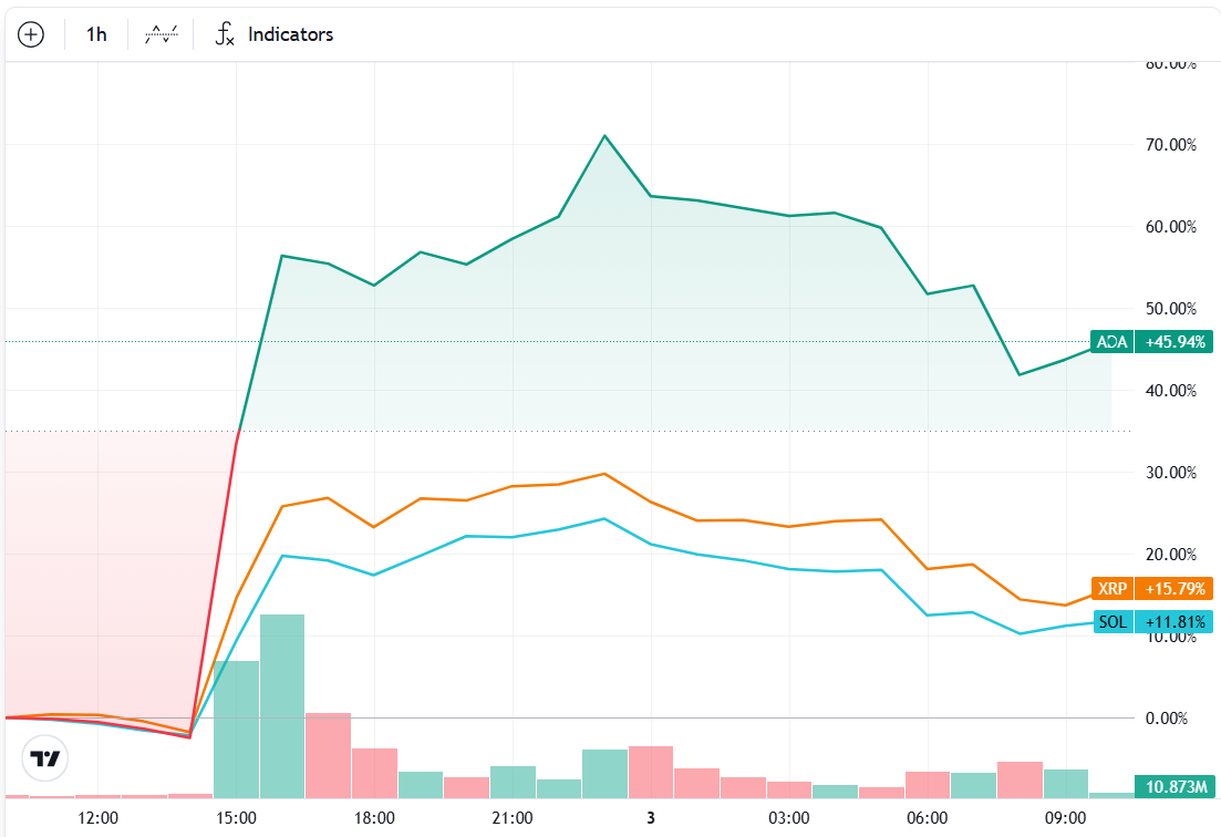 ADA, SOL и XRP показали более высокие результаты на фоне заявления Трампа об их включении в стратегический резерв США.