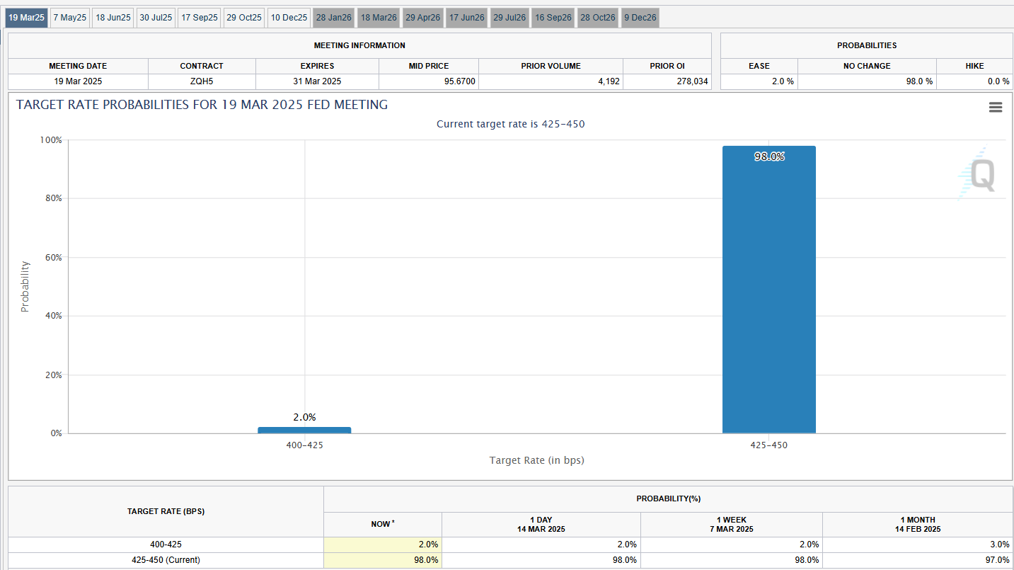 Предсказания сделаны на несколько дней раньше заседания FOMC, запланированного на 19 марта. В настоящее время на рынке оценивается 98%-ная вероятность того, что ФРС оставит процентные ставки на прежнем уровне, согласно последним оценкам инструмента FedWatch группы CME.