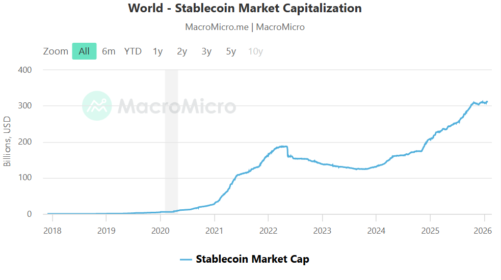 По отраслевым данным, общий рынок стейблкоинов остается примерно на одном уровне с октября: в обращении находится около $310 млрд фиатных токенов. При этом с января 2024 года до начала 2025-го предложение более чем удвоилось.