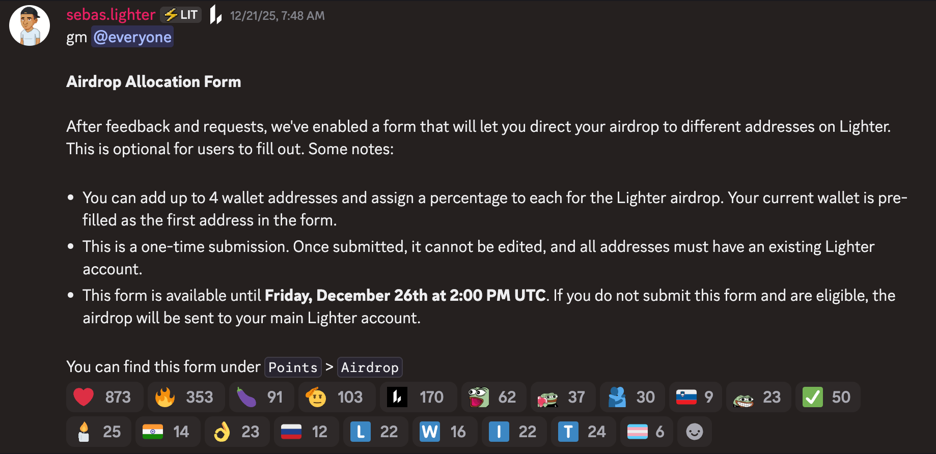 «Если вы не заполните эту форму и имеете право на получение, airdrop будет отправлен на ваш основной аккаунт Lighter», — сказал Себасв Discord.
