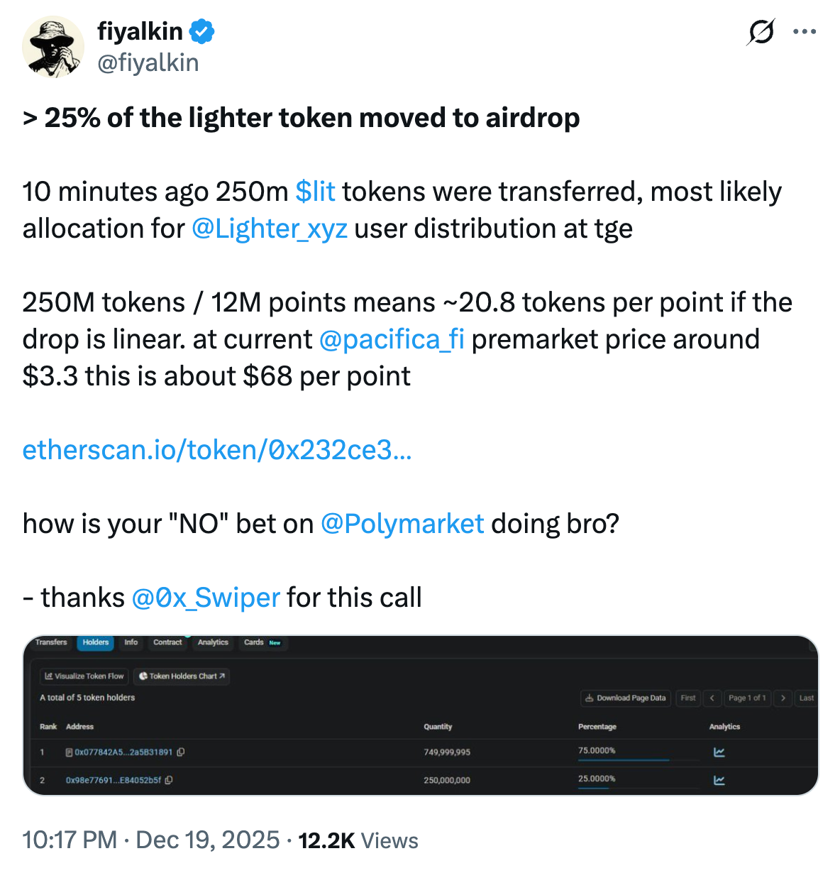 Lighter перевела 250 миллионов токенов LIT — это составляет 25% от общего количества — в пятницу, вызвав спекуляции в сообществе, что этот шаг может свидетельствовать о предстоящем airdrop для пользователей до TGE, который ожидается к 31 декабря.