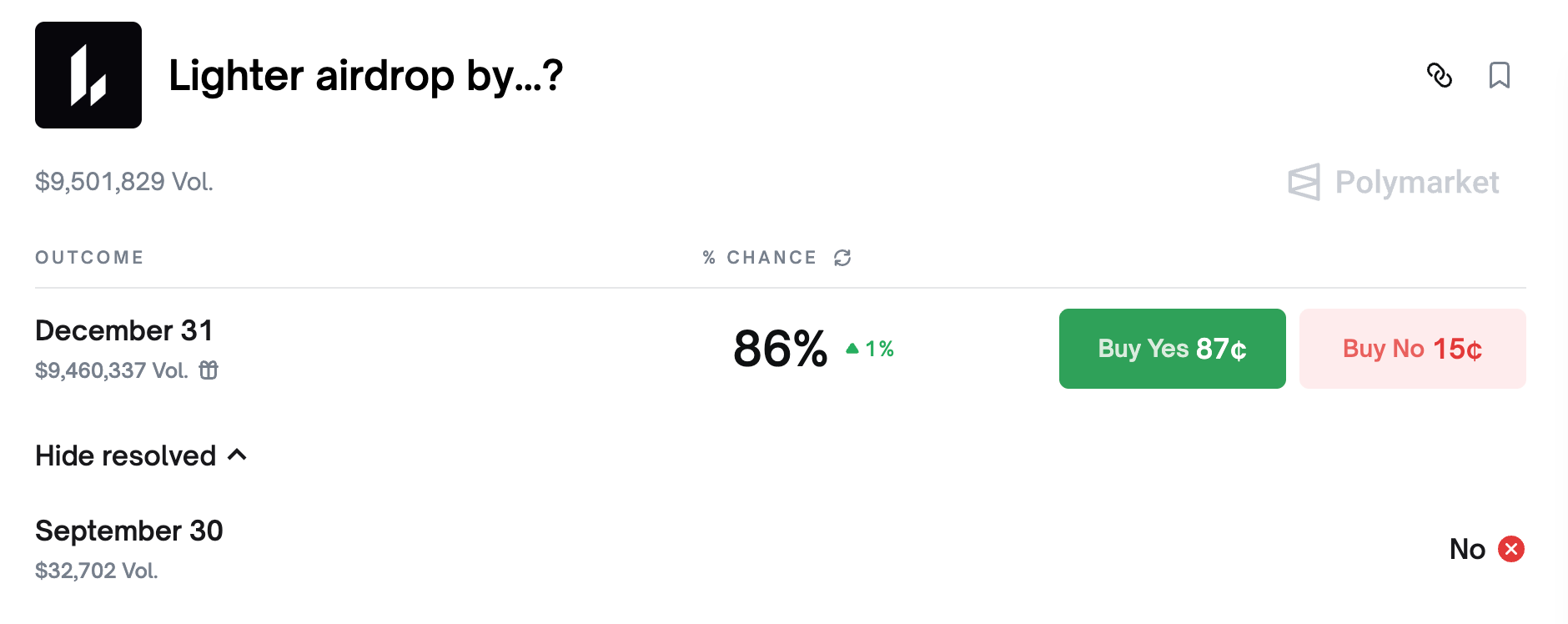 На фоне растущего ожидания у сообщества, вероятности, что airdrop от Lighter состоится до конца года, поднимаются на рынке предсказаний Polymarket, причем объем ставок в $9,5 миллиона поддерживает такие прогнозы на реализацию до 31 декабря.