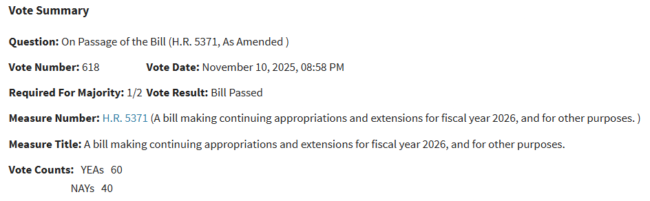 Формально правительство США все еще закрыто в момент публикации, но резолюция, которая обеспечила бы финансирование критических государственных служб до января, уже была передана из Сената в Палату представителей.
