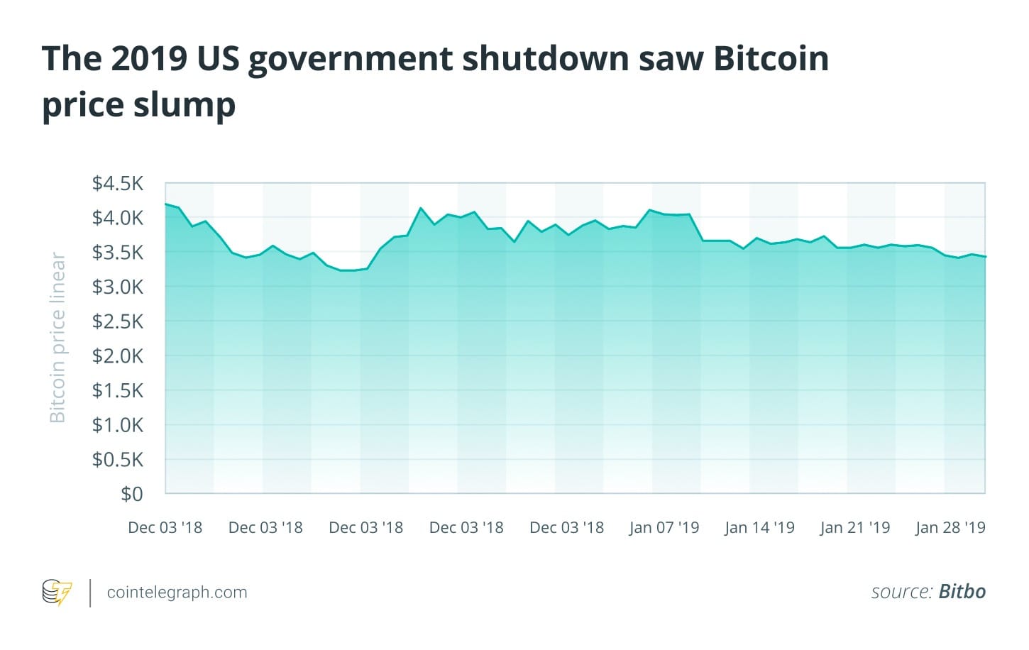 Тогда цена Биткоина упала на 16% — с $4200 до $3500. Но после открытия правительства цена Биткоина взлетела до $13000, то есть почти на 300% за пять месяцев.