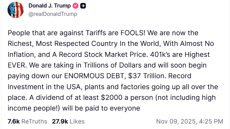 История может не повториться точно, но она рифмуется. Упоминая значительный приток доходов от торговых тарифов, которые он начал вводить в этом году, Трамп объявил, что выпустит стимуляционный чек на $2000 для американцев.