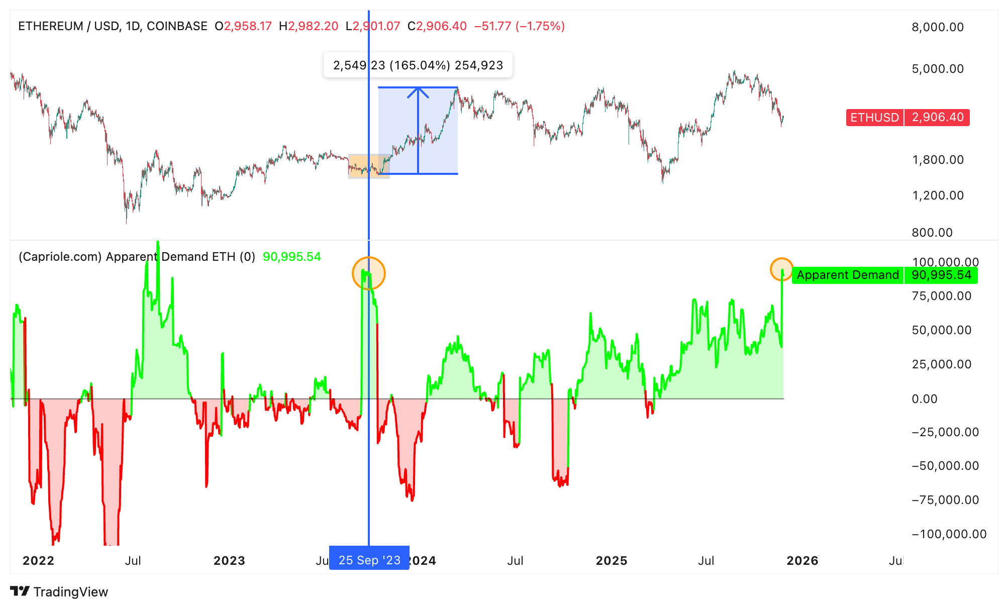 В последний раз спрос был столь высоким в сентябре 2023 года, когда цена колебалась между $1,500 и $1,700 после падения на 25%. За этим последовало ралли на 165%, достигшее $4,100 в марте 2024 года.