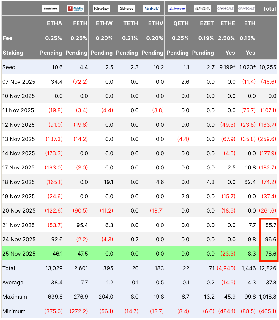 Этот разворот произошел после периода утрат с 11 по 20 ноября, в течение которого фонды Ethereum потеряли в сумме $1.28 миллиарда, что стало одной из самых продолжительных и глубоких красных волн с момента запуска ETF.