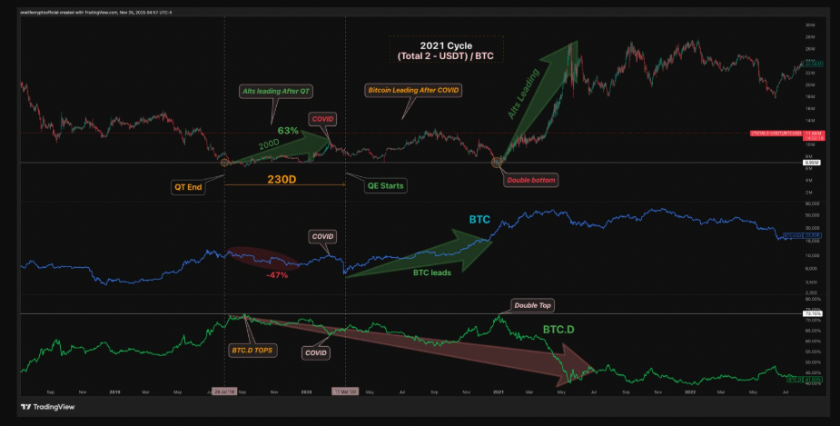 Диаграмма также показывает, что доминирование Bitcoin достигло пика сразу после окончания QT, а затем продолжило снижаться, формируя двойную вершину в период COVID-19, прежде чем возобновить падение.