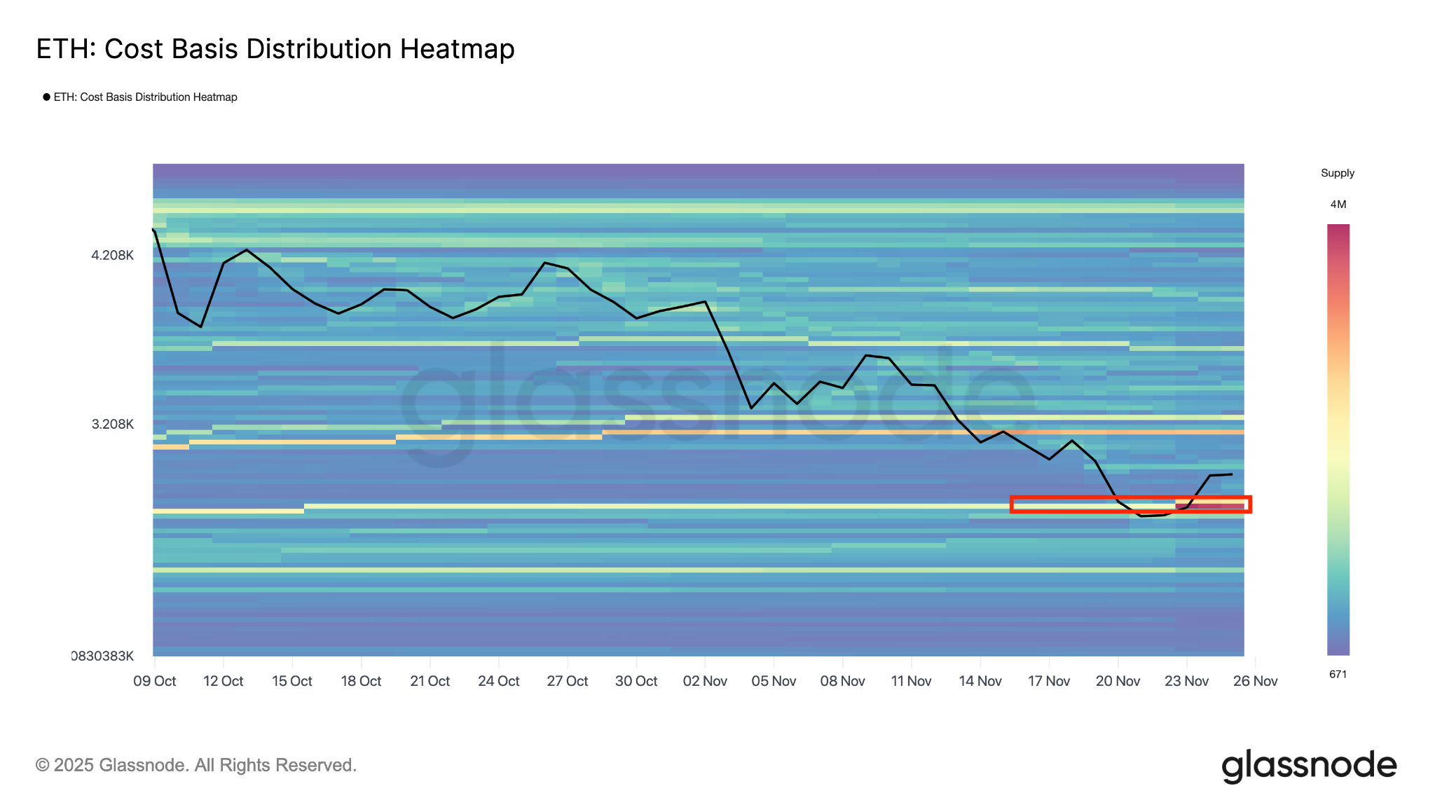 Согласно данным о распределении стоимости Ether, инвесторы приобрели приблизительно 4.95 миллиона ETH по средней стоимости от $2,800 до $2,830, создавая потенциальную зону поддержки.