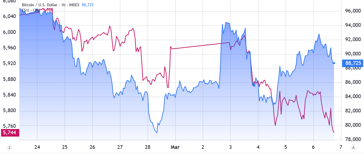 Фьючерсы S&P 500 (слева) против Bitcoin/USD (справа). Источник: TradingView / dc.finance