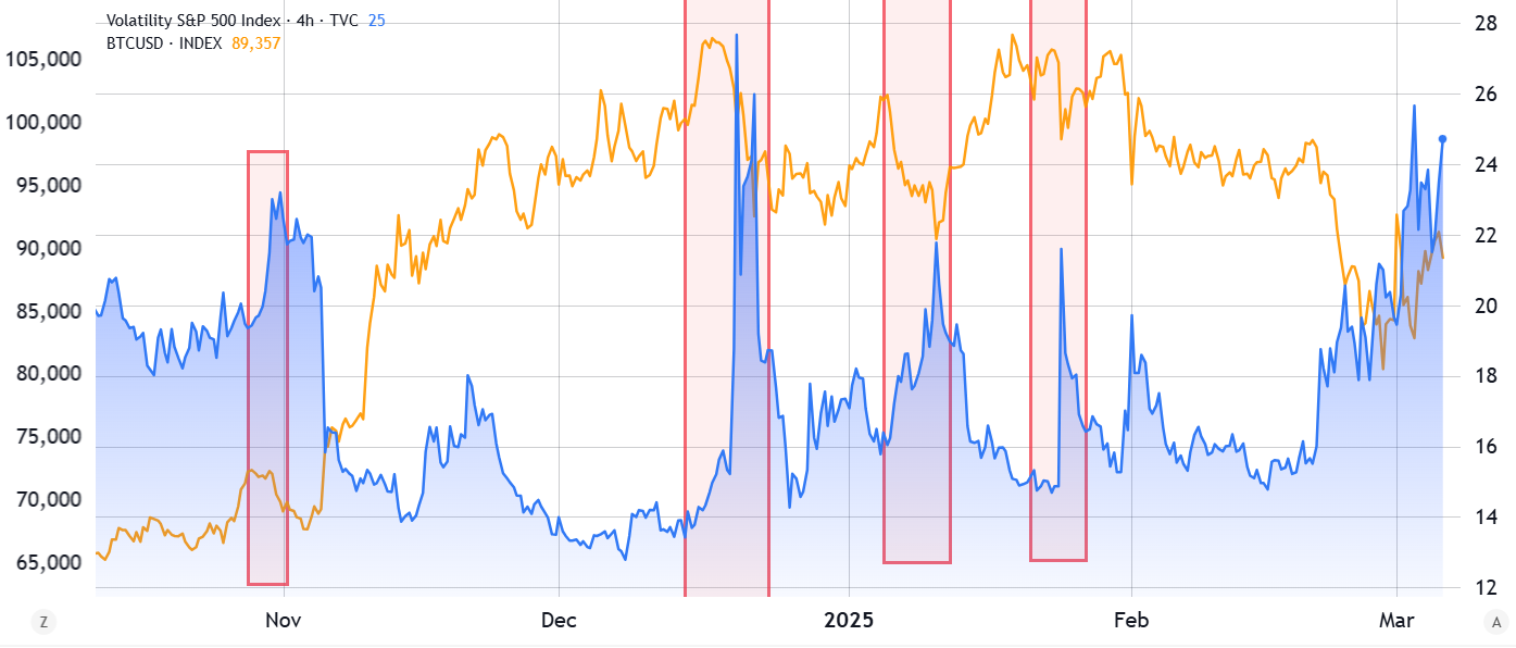 Bitcoin/USD (слева, оранжевый) против волатильности S&P 500 VIX. Источник: TradingView / dc.finance