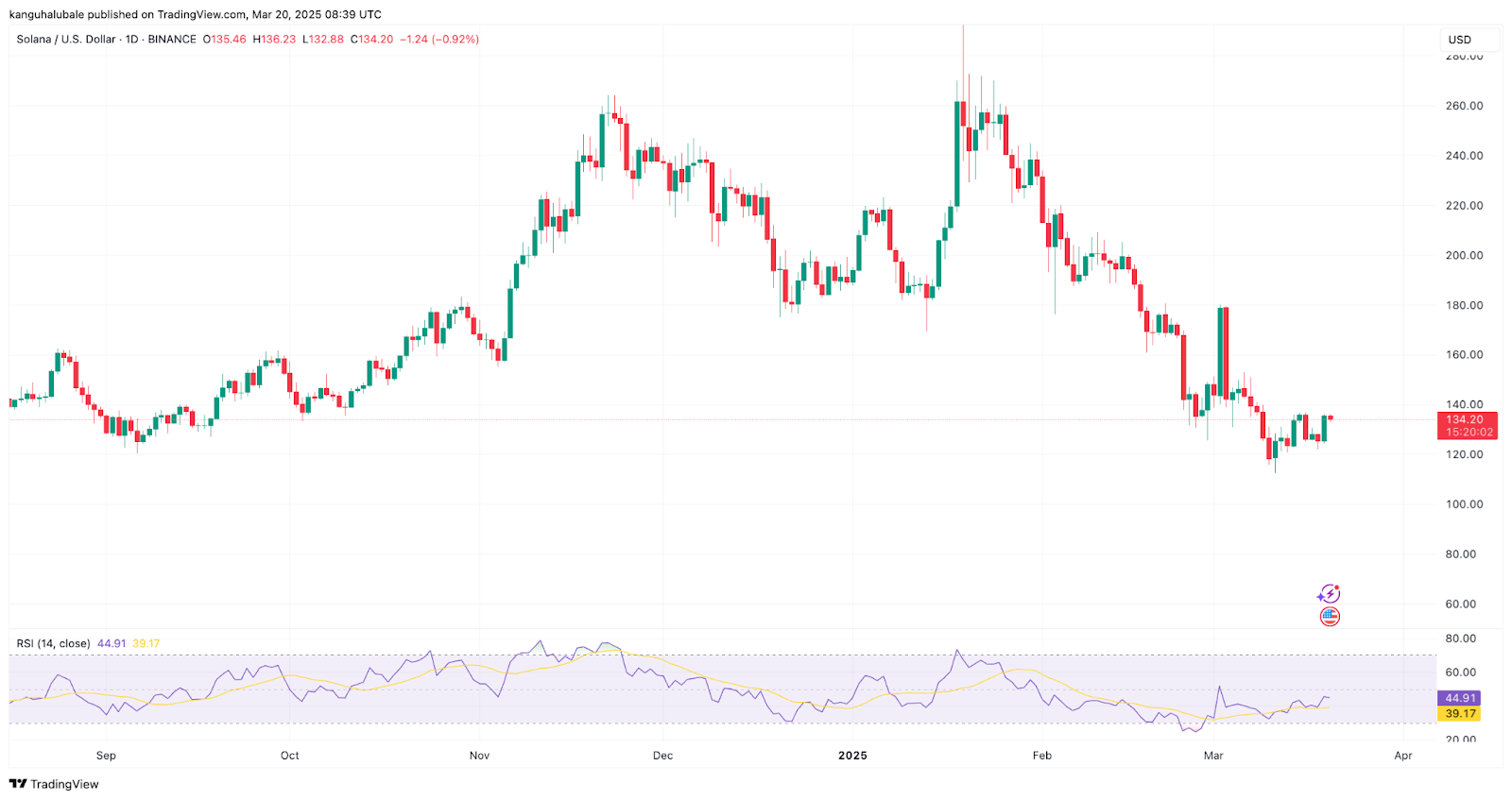 Данные от dc.finance Markets Pro и TradingView показывают, что цена SOL торгуется около $134, увеличившись более чем на 6% за последние 24 часа. Цена Solana восстановилась примерно на 20% от локального минимума в $112, достигнутого 11 марта.