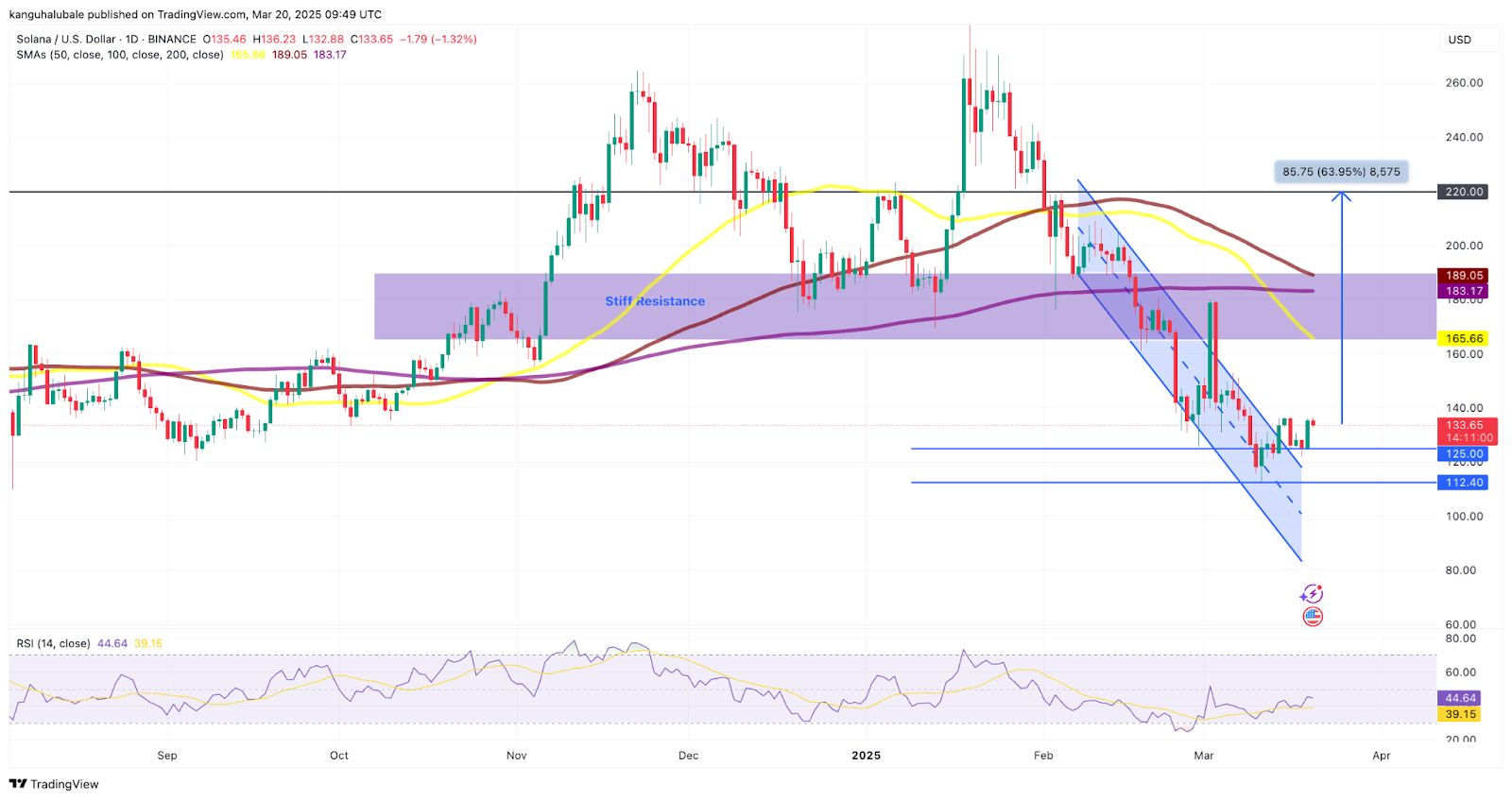 SOL все еще торгуется значительно ниже максимума в $220, достигнутого 5 февраля. Однако быки установили поддержку вокруг $110 и $125 на верхней границе нисходящего канала.