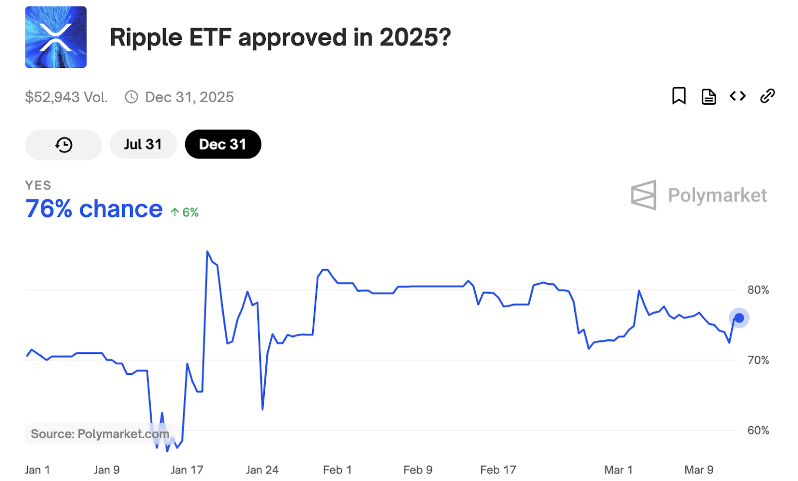 Вероятность одобрения биржевого фонда XRP на Polymarket. Источник: Polymarket